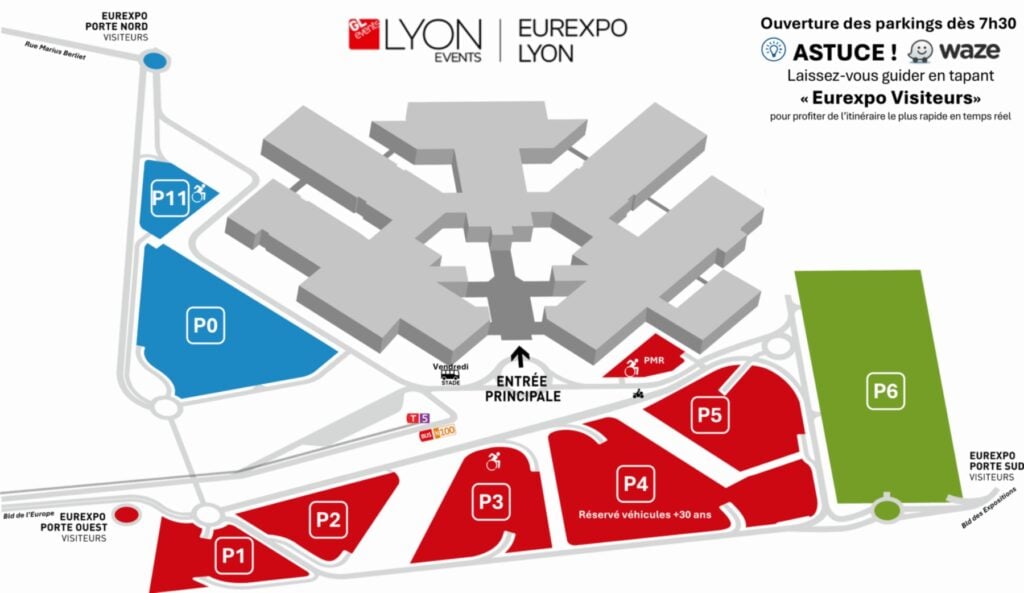 Pour un accès fluide, il est conseillé d’arriver par l’entrée Nord (sortie 8, Rocade Est/N346) ou par l’entrée Ouest (sortie 4, A43). Les visiteurs peuvent également se laisser guider grâce à l’application Waze en recherchant : Eurexpo Visiteurs Nord, Ouest ou Sud. En cas de saturation d’un secteur, les automobilistes sont automatiquement dirigés vers une autre porte.