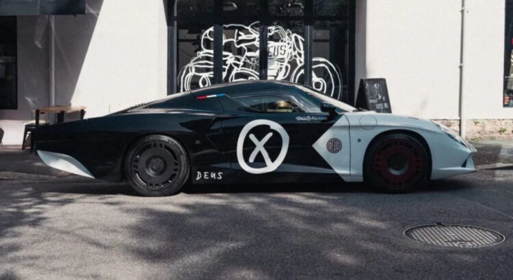 Pour cette version unique, le directeur créatif de Deus, Carby Tuckwell, a travaillé avec La Squadra et Zagato. La carrosserie reçoit une livrée monochrome très graphique, avec un immense "X" encerclé sur les portes, des jantes de couleurs opposées et de fines touches rouges et bleues près du pavillon ; on pense autant à une board Deus accrochée au mur qu’à une voiture de course perdue dans une galerie.