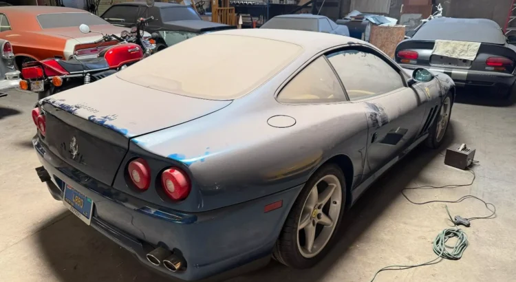La première star de cette sortie de grange californienne est une Ferrari 550 Maranello de 2000, habillée d’un élégant bleu Nart. Restée sous bâche pendant un quart de siècle, elle n’affiche que 908 km au compteur. Autant dire qu’elle n’a pratiquement jamais roulé.