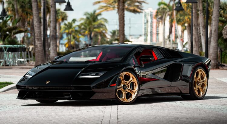 L’exemplaire proposé par GAA Classic Cars Auction est une voiture de 2022 affichant seulement 146 miles, soit environ 235 km. Elle a été livrée neuve au revendeur qui la possède encore aujourd’hui, dans une configuration Deep Black à l’extérieur et cuir Rosso Alala à l’intérieur, soulignée par des jantes dorées décalées et de nombreux inserts en carbone. Côté technique, on retrouve le châssis monocoque en carbone, les freins carbone-céramique assistés, des amortisseurs magnétorhéologiques à poussoirs, la direction arrière, l’ESP, un système de levage de l’essieu avant, mais aussi un toit à vitrage électrochromique et un écran tactile central. La voiture est vendue avec sa documentation d’origine, ses outils, son sticker de vitrine, une maquette au 1:18 et un rapport Carfax vierge, lors des ventes organisées à Greensboro du 19 au 21 février 2026. À son lancement, le prix catalogue de la Countach LPI 800-4 tournait autour de 2,3 M€ en Europe. Sur le marché de l’occasion, plusieurs annonces européennes récentes affichent des exemplaires très peu roulés entre environ 2,25 M€ et plus de 3,2 M€, souvent avec moins de 1 000 km au compteur et des configurations aussi spectaculaires.