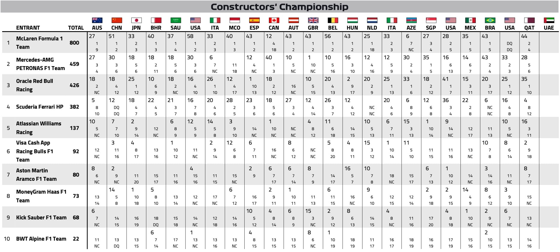 Saison F1 2025 : le classement provisoire des Constructeurs