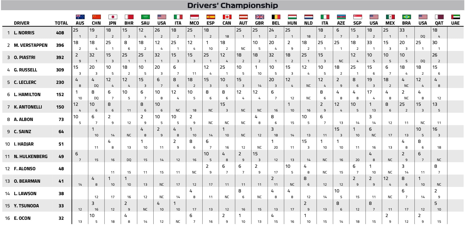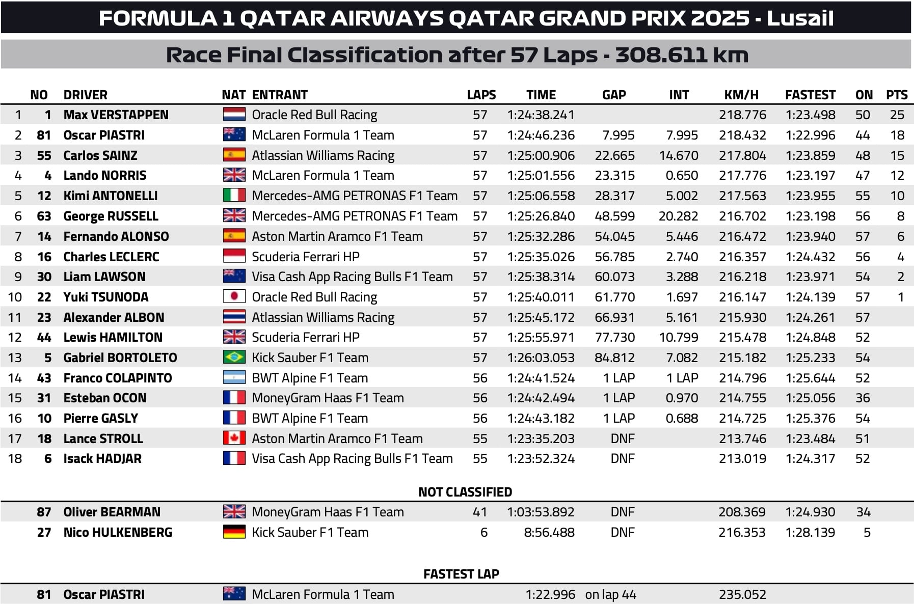 GP du Qatar F1 2025 : le classification officielle