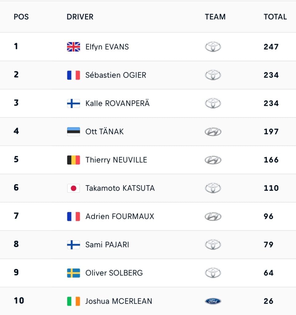 WRC 2025 : classement mondial des Pilotes (top 10 provisoire après l'Europe Centrale)