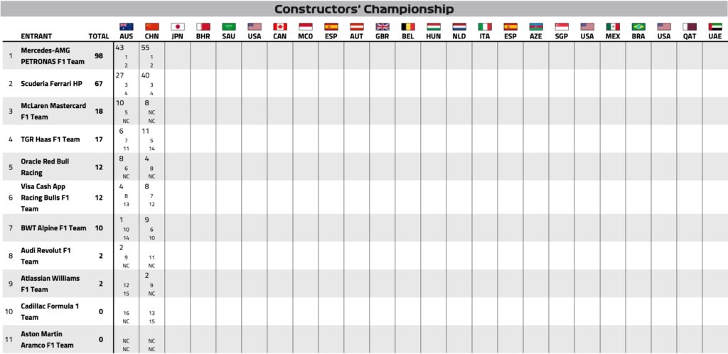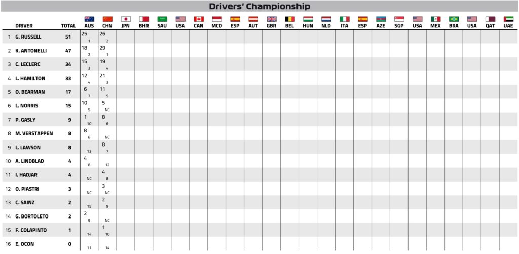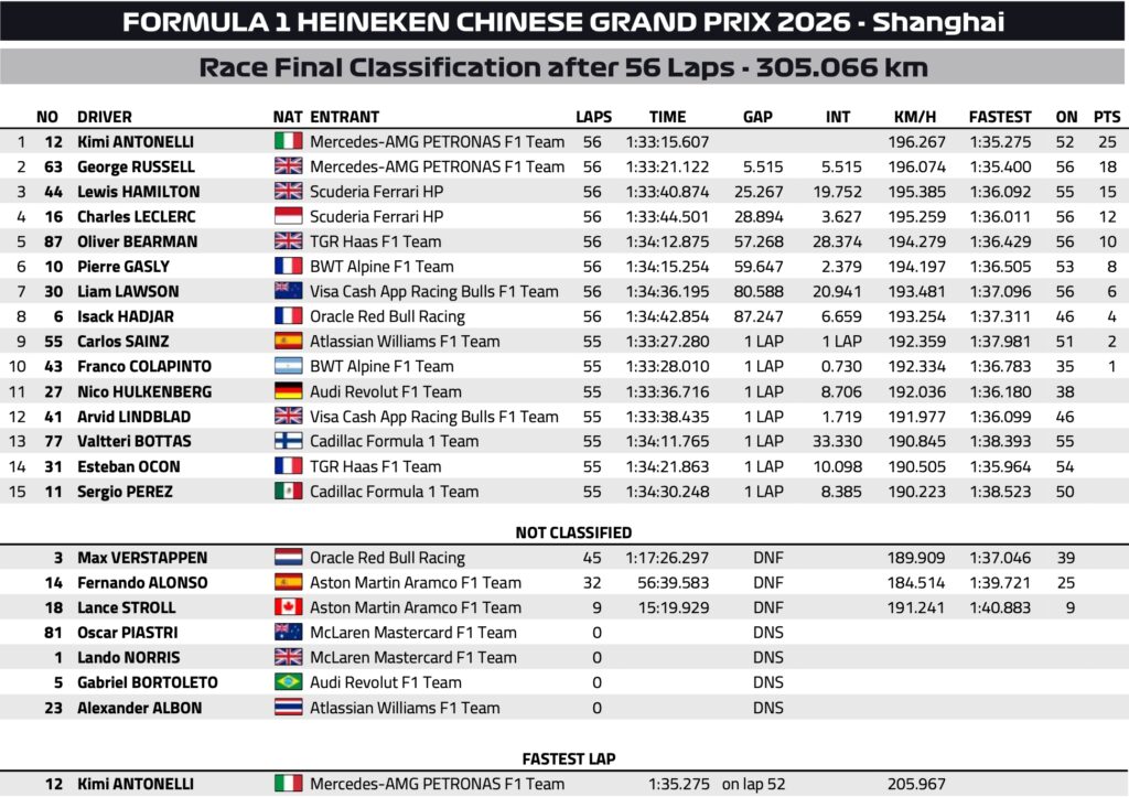 De même, l'épreuve chinoise a de nouveau tourné court pour les Aston Martin, Lance Stroll devant se retirer dès le 9ème tour, imité au 32ème par Fernando Alonso qui portait à sept le nombre de pilotes absents à l'arrivée. Prochaine étape du calendrier 2026 dans deux semaines avec le Grand Prix du Japon sur le mythique tracé de Suzuka.