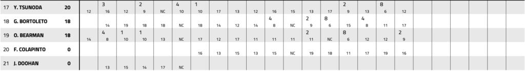 Piastri se contentait du quatrième rang, de quoi limiter sa perte de points à seulement trois dans l'optique de la lutte pour le titre mondial des Pilotes (voir les classements ici ou ci-dessous), tout en complétant le tir groupé des McLaren.