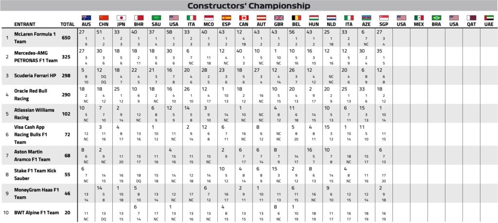 Saison F1 2025 : le classement provisoire des Constructeurs