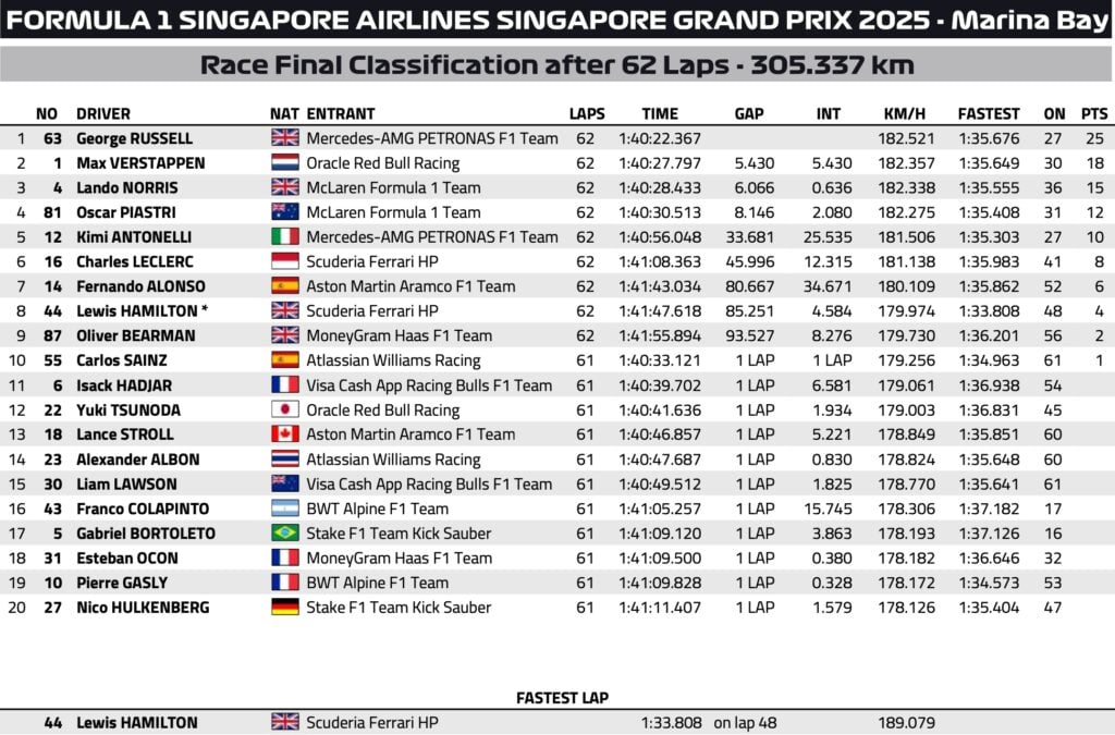 GP de Singapour F1 2025 : la classification officielle