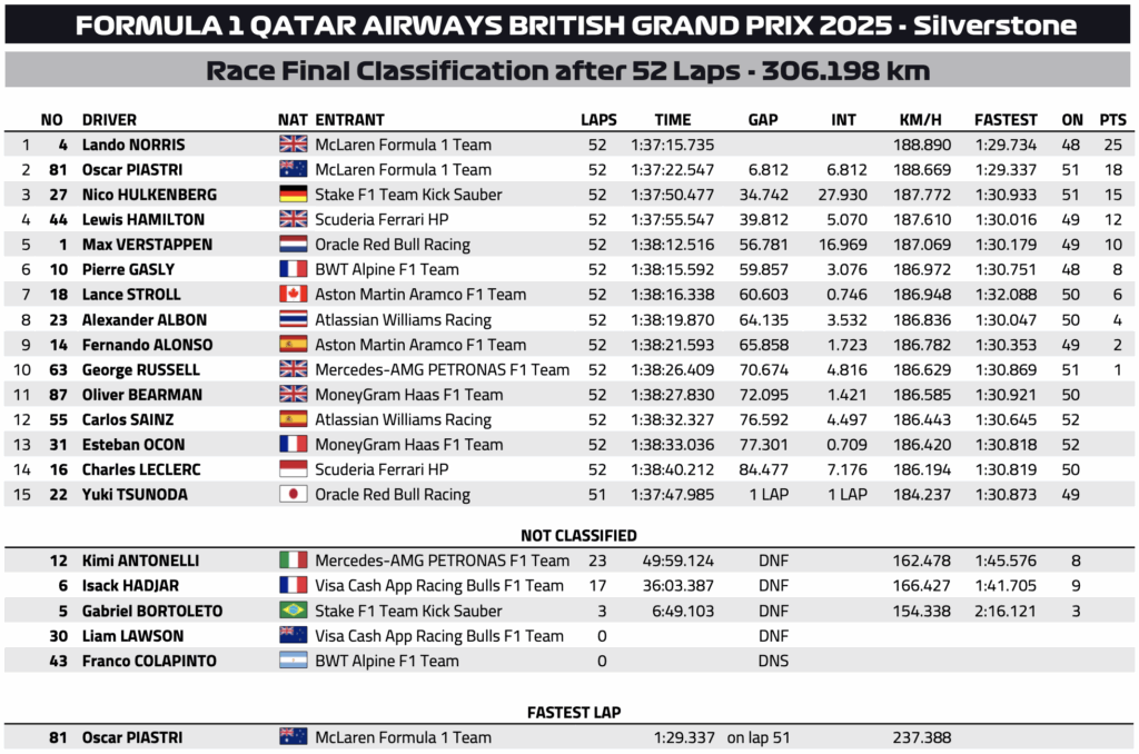 GP de Grande-Bretagne F1 2025 : classification officielle