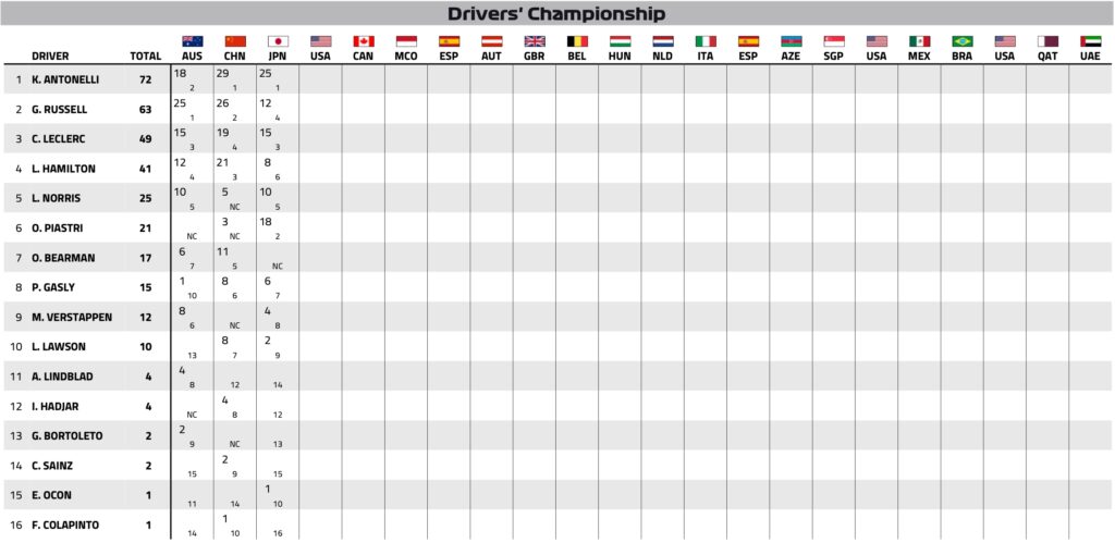 F1 2026 : classement provisoire du Championnat du monde des Pilotes