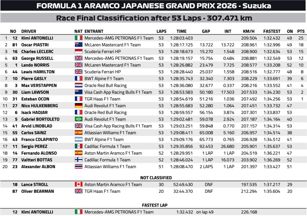 GP du Japon F1 2026 : le classement officiel
