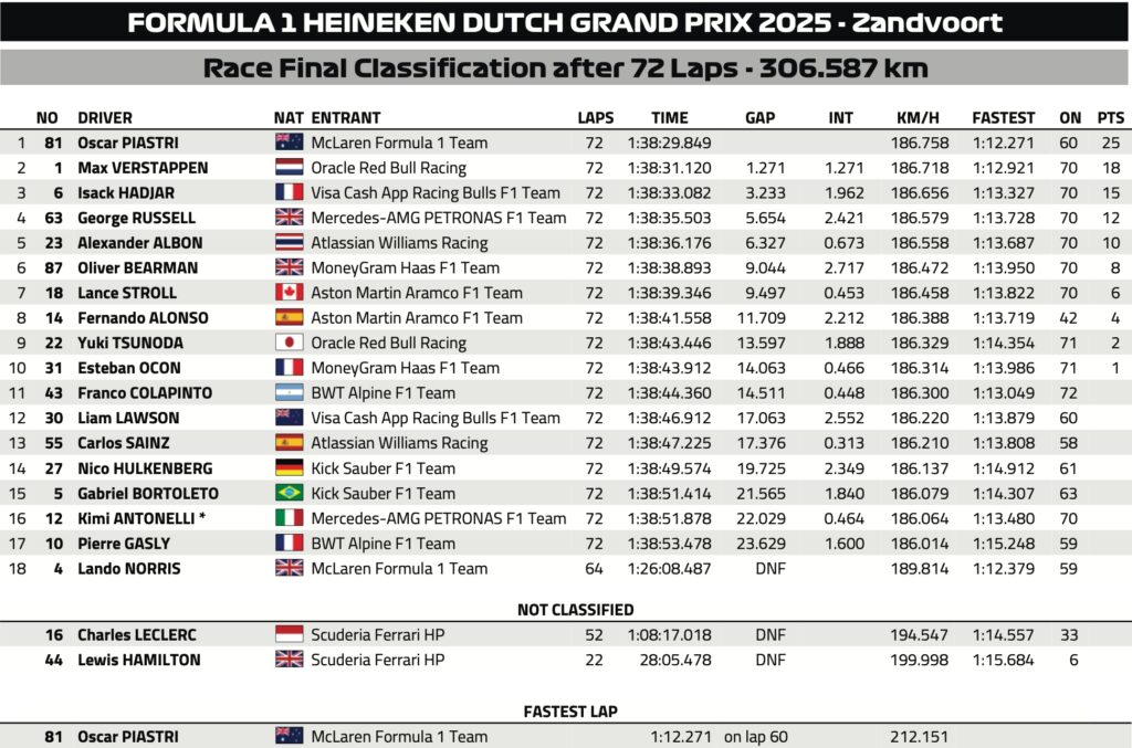F1 - GP des Pays-Bas : victoire de Piastri, 1er podium pour Isack Hadjar !