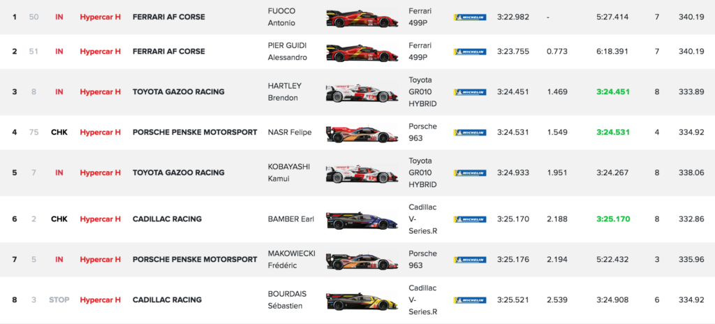 La deuxième Toyota n°7 signait le cinquième temps avec Kamui Kobayashi (+ 1.9) devant les deux Cadillac, la n°2 (Earl Bamber) et la n°3 (Sébastien Bourdais) encadrant la deuxième Porsche n°5 de Frédéric Makowiecki.