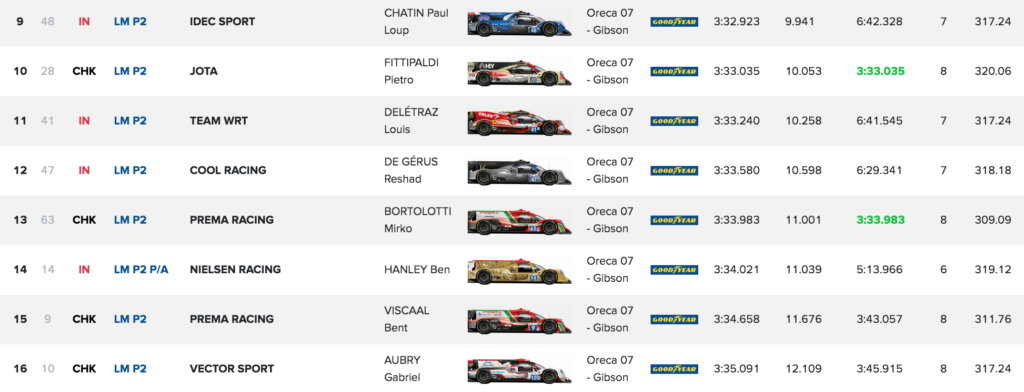 En LMP2, la pole position de classe est revenue en 3:32.923 à l’Oreca 07-Gibson n°48 d'Idec Sport aux mains de Paul Loup Chatin. Il s'est imposé devant la JOTA n°28 de Pietro Fittipaldi et la Team WRT n°41 de Louis Delétraz.