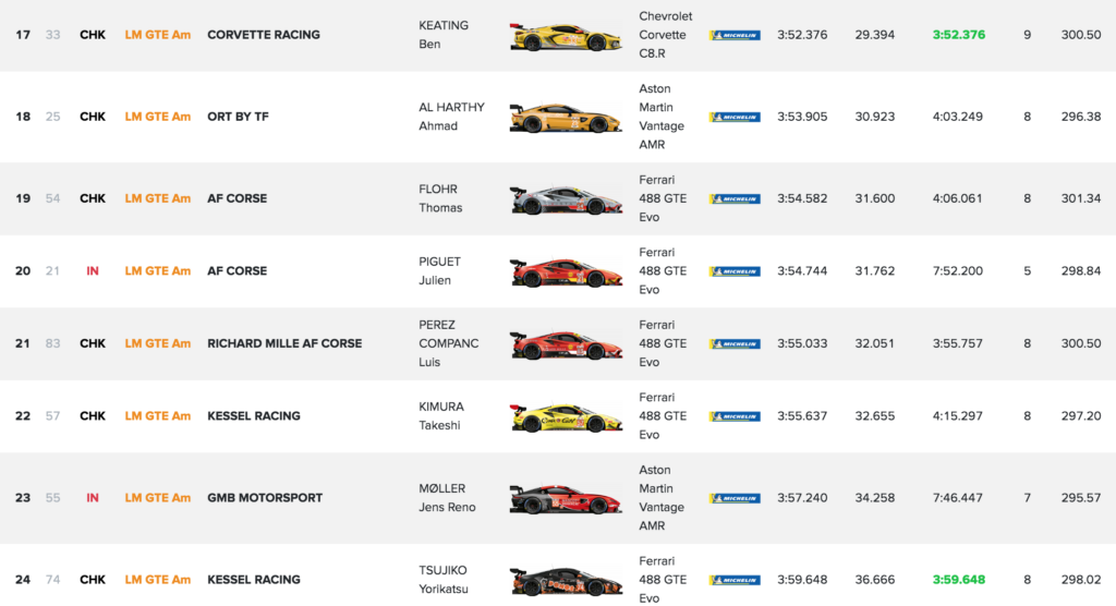 Enfin, du côté des LMGTE Am, l'unique Corvette engagée dans le Centenaire a fait la loi en 3:52.376. Ben Keating a devancé l'Aston Martin Vantage AMR n°25 ORT by TF de Ahmad Al Harty et la Ferrari 488 GTE Evo n°25 AF Corse de Thomas Flohr.