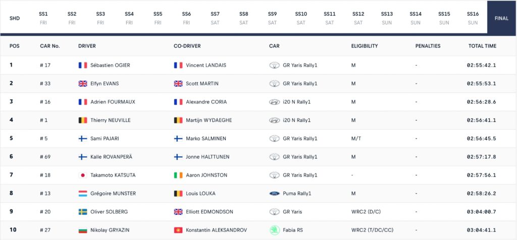 Adrien Fourmaux, leader à l’issue de la première journée, a finalement terminé le rallye à la troisième place, signant son troisième podium de la saison. Derrière le Français, Thierry Neuville a pris la quatrième position, à 12,5 secondes. Son équipier Ott Tänak, contraint à l’abandon vendredi alors qu’il menait, n’a pu finalement marquer qu’un point.