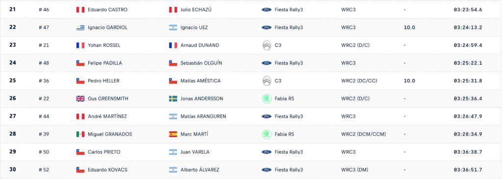 Deuxième du championnat en arrivant au Chili, Kalle Rovanperä a reculé au troisième rang après une sixième place finale, sa course étant compromise par une crevaison. Takamoto Katsuta et Grégoire Munster complètent le top 8. En neuvième position, Oliver Solberg a décroché le premier titre de la saison en s’imposant en WRC2 face à Nikolay Gryazin.