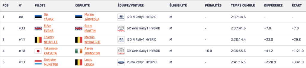 Grégoire Munster (M-Sport Ford) a réalisé une belle prestation en terminant cinquième, égalant ainsi son meilleur résultat en WRC, après le retrait de Sami Pajari (Toyota) suite à un accident dans l'ES15.