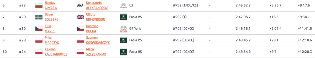 En WRC2, Nikolay Gryazin (Citroën) a remporté la victoire, devançant Oliver Solberg (Skoda) de 26.1 secondes. Solberg reste en lice pour le titre, bien qu’il ne soit plus éligible aux points pour cette manche. Le top dix a été complété par Filip Mareš, Miko Marczyk et Kajetan Kajetanowicz.