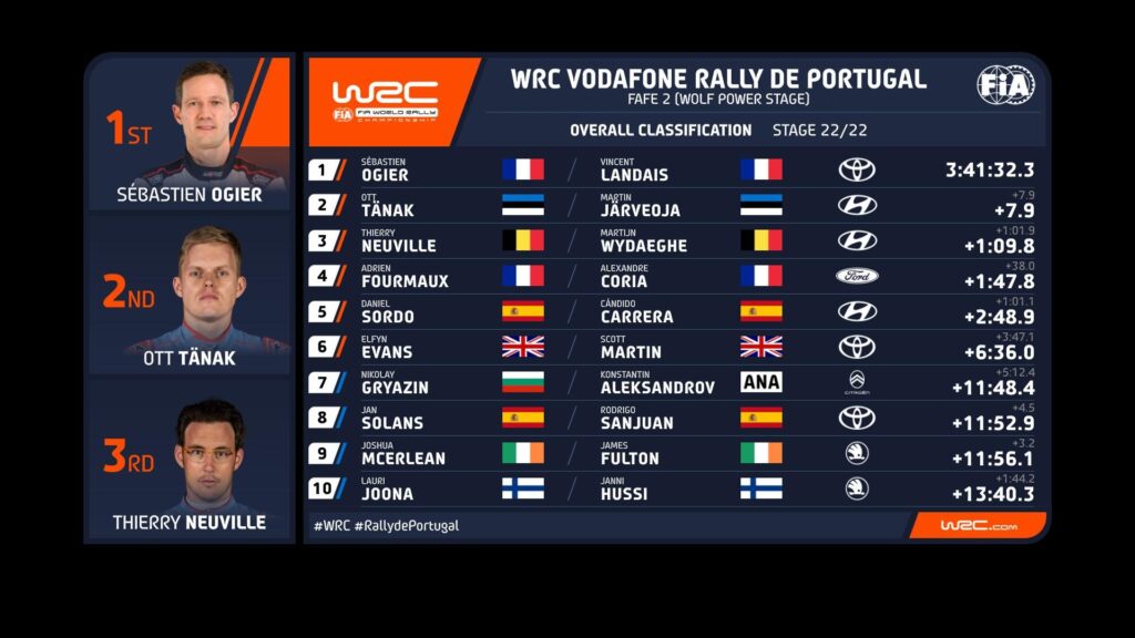 Sébastien Ogier est devenu le premier pilote à s’imposer à six reprises dans le Rallye du Portugal WRC devant Ott Tänak et Thierry Neuville, qui conforte son avantage au classement du championnat du monde.