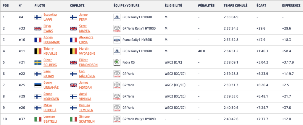 Cinquième, Oliver Solberg (Skoda Fabia RS Rally2) s’imposait à domicile dans la catégorie WRC2 devant les Toyota de Sami Pajari, Georg Linnamäe, Roope Korhonen et Mikko Heikkilä. Pour son deuxième départ en autant d’années, l'Italien Lorenzo Bertelli (Toyota) complétait le top dix.