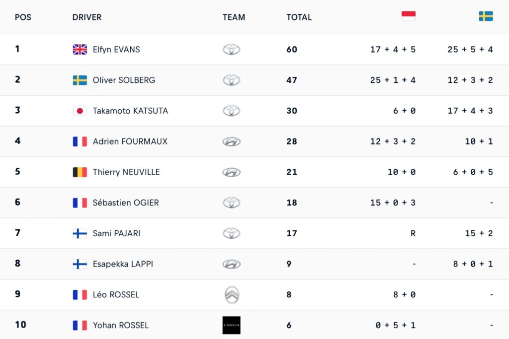 10 provisoire ci-dessous) avec 13 points d’avance sur Solberg. Chez