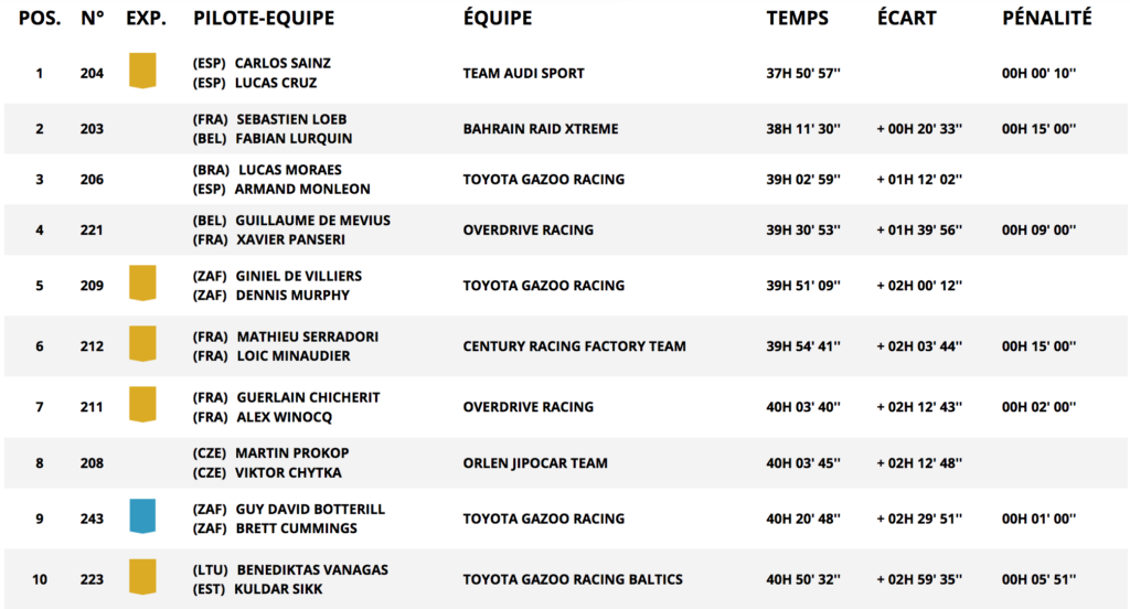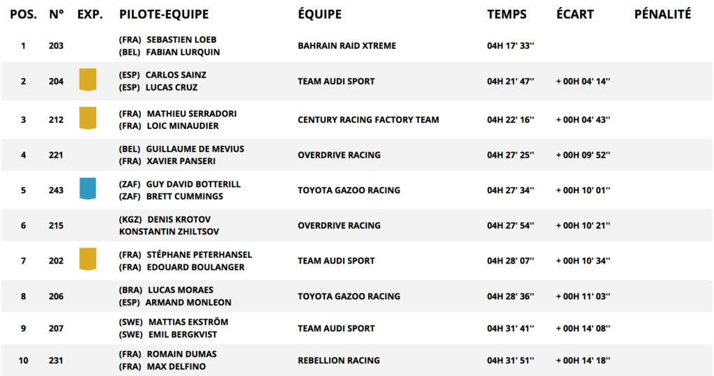 Au terme de l'Etape 9, disputée sur 639 km (dont 417 chronométrés) entre Hail et Al Ula, Sébastien Loeb et son navigateur Fabian Lurquin se sont imposés au chrono, le 27e scratch sur le Dakar pour l'Alsacien.