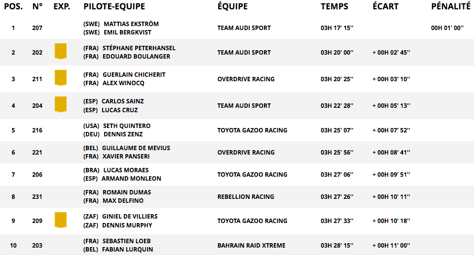 Résultat des courses : Loeb et son équipier ralliait le bivouac au 10ème rang en concédant 5 min 47 s sur Sainz, quatrième. Au général, les deux rivaux sont séparés par près de 25 minutes à quatre spéciales du terme du rallye-raid.