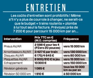 Bien sûr, un modèle optionnel vous coûtera encore plus cher ! Le budget freinage pique un peu, plus de 3 070 € pour un seul disque avant (2 330 € pour l’arrière), et 900 € le jeu de plaquettes avant (à remplacer tous les 10 - 15 000 km environ !). Les amortisseurs affichent, eux aussi, un prix élevé (1 715 € pièce), mais ils peuvent tenir au moins 120 000 km, à condition d’éviter de jouer à « saute-vibreur » ! Quant aux pneumatiques, comptez 2 605 € pour un train complet, à changer tous les 15 000 km environ…