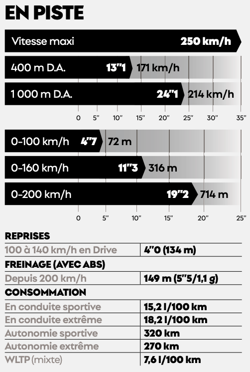 Le lendemain, les mesures à Mortefontaine confirmeront la bonne santé de la mécanique, qui abat le 0 à 100 km/h en 4”7, malgré un launch control trop peu déterminé. Mais les reprises faiblardes trahissent son manque de punch à bas régime.