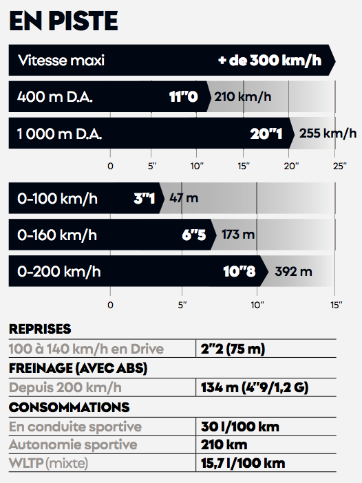 Cela n’empêche pas les rétrogradages automatiques d’expédier les relances avec un 100 à 140 km/h en deux-deux, c’est le cas de le dire : 2’’2. Quant aux distances de freinage, elles font état de 134 m pour passer de 200 km/h à l’arrêt complet.
