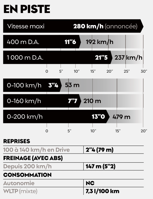 La piste relativement plane du Vigeant n’a pas levé le voile sur des mouvements de caisse parasites, que l’on imagine présents sur une surface plus exigeante. L’inertie sensible dont elle fait preuve annihile les sensations, et la transmission peine à suivre le rythme, notamment lors des rétrogradages, que l’on aurait aimés moins timides.