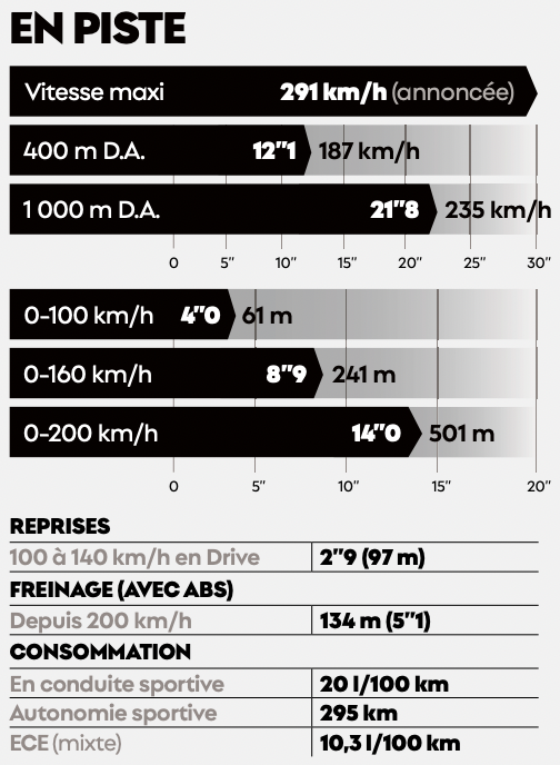 Même avec deux roues motrices, son grip naturel lui permet de couvrir le 0 à 100 km/h en 4’’0 tout rond, le 0 à 160 km/h en 8’’9 et le 0 à 200 km/h en 14’’0. Sans parler des 400 m D.A. en 12’’1 et du 1 000 m D.A. en 21’’8. Les reprises sont du même acabit, avec 2’’9 pour passer de 100 à 140 km/h en Drive. C’est aussi et surtout grâce au temps au tour sur le circuit du Vigeant qu’elle démontre son potentiel.