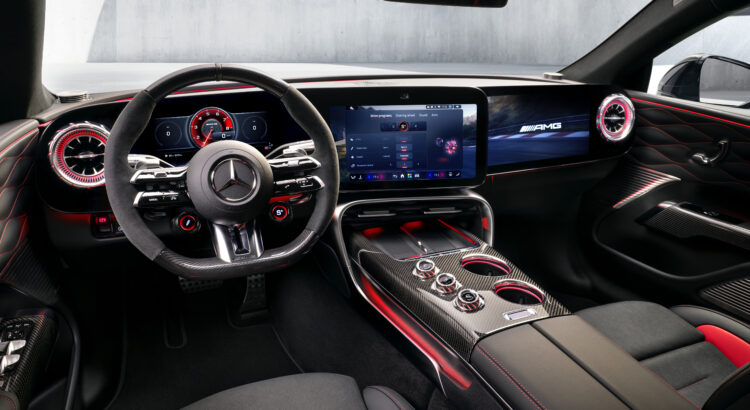 Mercedes-AMG présente l’intérieur de la nouvelle Mercedes‑AMG GT Coupé 4 portes. Les visuels montrent un cockpit électrique taillé pour la performance. Comment ce poste de pilotage concilie course et confort ?