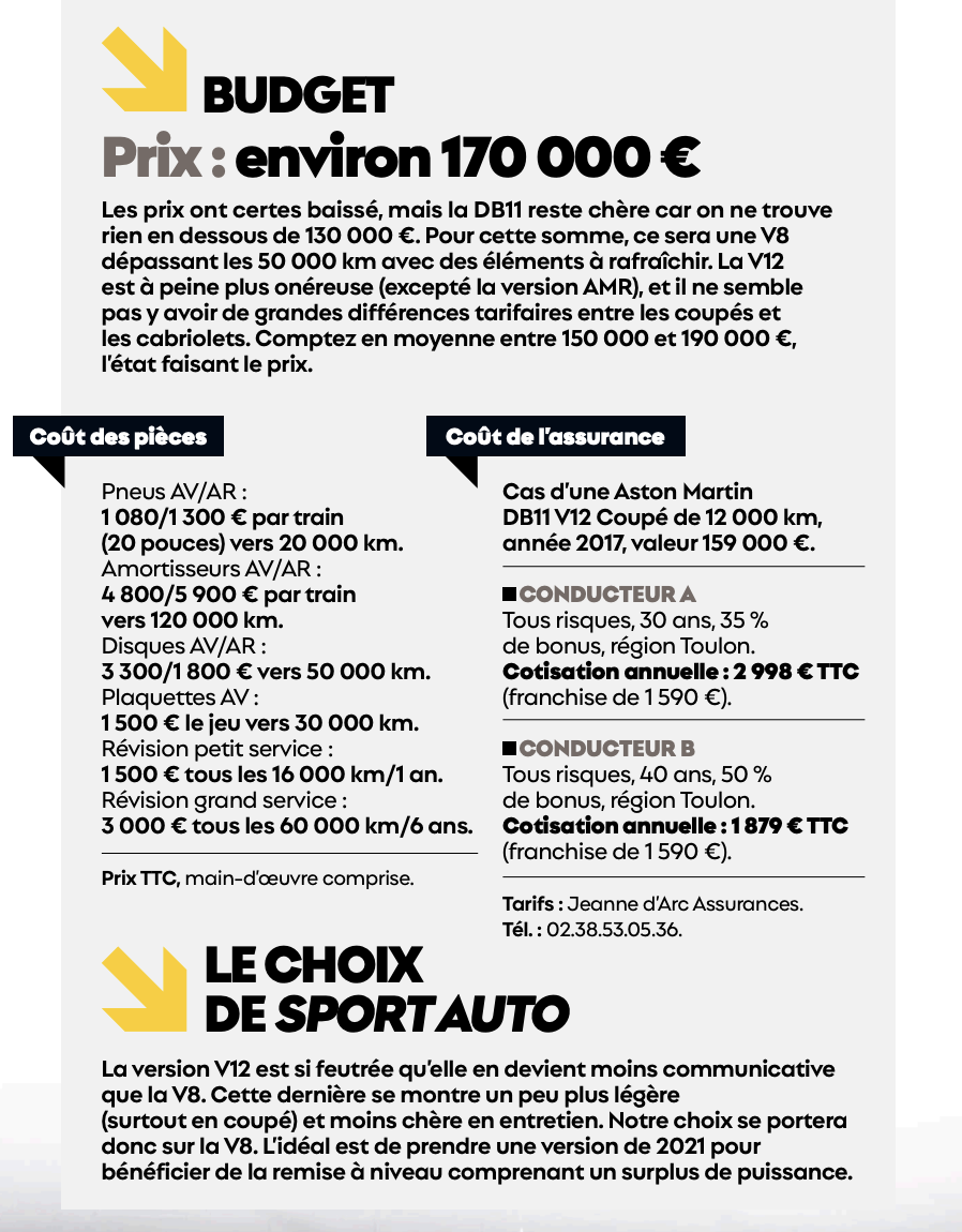 En 2021, la V8 jouit des améliorations introduites sur la Vantage F1 Edition pour gagner 25 ch (535 ch). La DB11 termine sa carrière en été 2023, lorsque la toute nouvelle DB12 prend le relais. Encore récente (donc chère), la DB11 s’échange au minimum à 130 000 € en V8, à peine plus en V12.