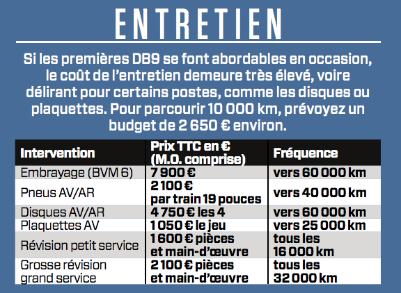 Comme on pouvait le craindre, la DB9 fait souffrir ses trains roulants, notamment en conduite rapide. Outre une usure précoce de certains périssables qui ne sont déjà pas donnés, comme les pneus ou les freins (4 200 € les quatre pneus et 4 750 € les quatre disques avec la main-d’œuvre), les premiers éléments à s’abîmer sont les silentblocs des triangles de suspensions, des composants réputés fragiles à vérifier avant d’acheter.