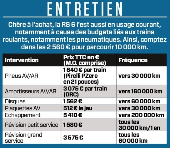 Avec 1 950 kg mesurés par nos soins, l’Audi RS 6 met à rude épreuve les trains roulants en cas de conduite rapide répétée, à commencer par… les freins ! Avant de s’aventurer sur circuit au cours d’un track day entre amis par exemple, sachez qu’un rythme extrême peut même faire approcher les disques de leur point de fusion, ce qui impliquera l’obligation de les remplacer : comptez 3 510 € pour l’ensemble complet, avec les plaquettes !