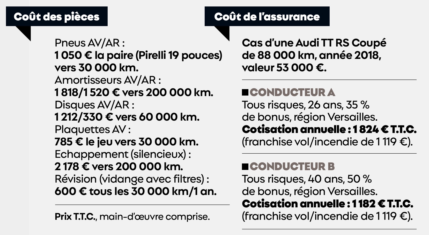 Rapporté à son niveau de puissance et à ses performances, ce TT RS n’est pas si cher en entretien… à condition d’éviter les concessions situées aux abords des grandes villes, où le taux horaire atteint des prix indécents. Pour parcourir 10 000 km, comptez 1 000 € environ.