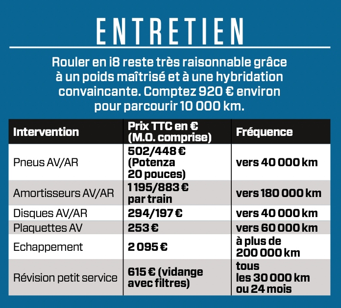 Ce n’est en revanche pas le cas du bloc thermique, un modeste 3 cylindres 1,5 litre de 231 ch gavé par un turbo, entraînant les seules roues arrière. L’ensemble étant prévu pour fonctionner de concert en forte accélération – ce qui donne à l’usage une singulière transmission intégrale –, ce petit bloc déjà vu sur l’i3 est finalement peu sollicité et affiche jusqu’à présent une belle fiabilité d’ensemble.