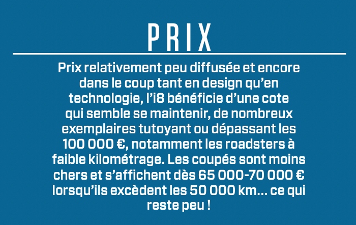 D’origine, l’i8 présente un excellent rendu, que ce soit au niveau des ajustages ou des peintures. Le moindre défaut visible à l’œil n’est pas normal : c’est que vous êtes en présence d’un exemplaire qui a été (mal) réparé à la suite d’un choc ! A noter que BMW a procédé à un rappel pour contrôler (et remplacer au besoin sur quelques modèles) le réservoir de carburant.