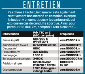 En coupé ou en cabriolet, la Camaro est une lourde GT (1 800 kg minimum en coupé), ce qui fait souffrir les trains roulants, notamment en conduite sportive. Les premiers « fusibles » sont les pneus, notamment arrière, qui peuvent partir en fumée en une journée de circuit. À plus de 920 € le train (Pirelli d’origine, en 20 pouces), cela n’a rien d’anodin. Cela étant, une conduite apaisée permet de parcourir 25 000 km avec le même train. Il en va de même du freinage, qui a fort à faire pour ralentir l’équipage.