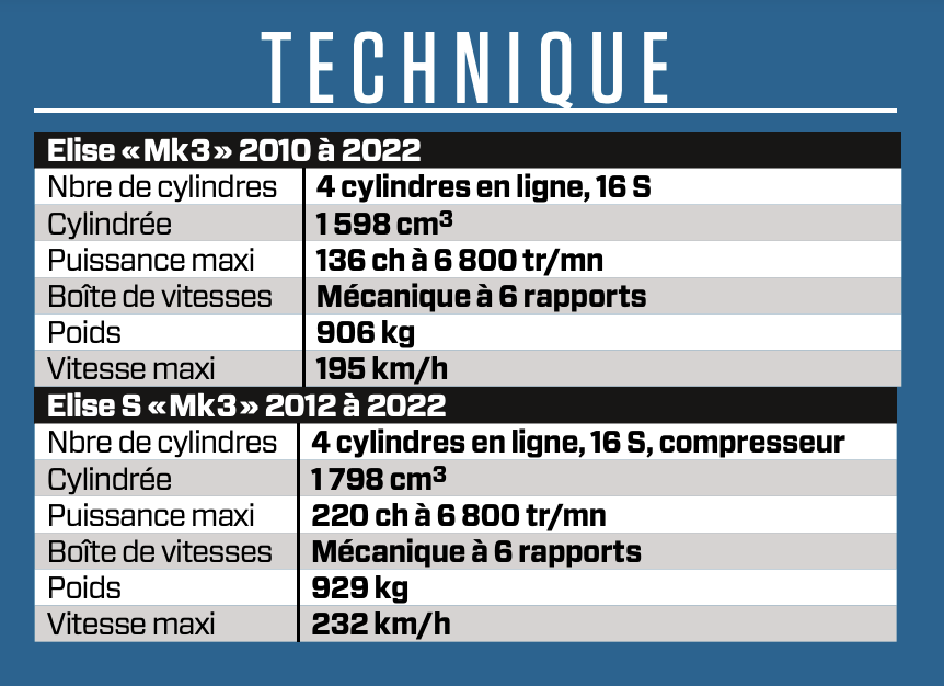 Lotus Elise "Mk3" (2010-2022) : fiche technique