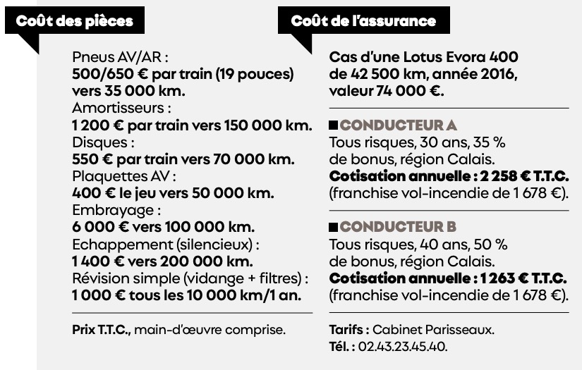 Raisonnable à l’achat, l’Evora reste attractive en entretien, excepté le poste « embrayage », vraiment excessif à cause de la main-d’œuvre. Pour parcourir en moyenne 10 000 km sur l’année, prévoyez 1 300 € environ.