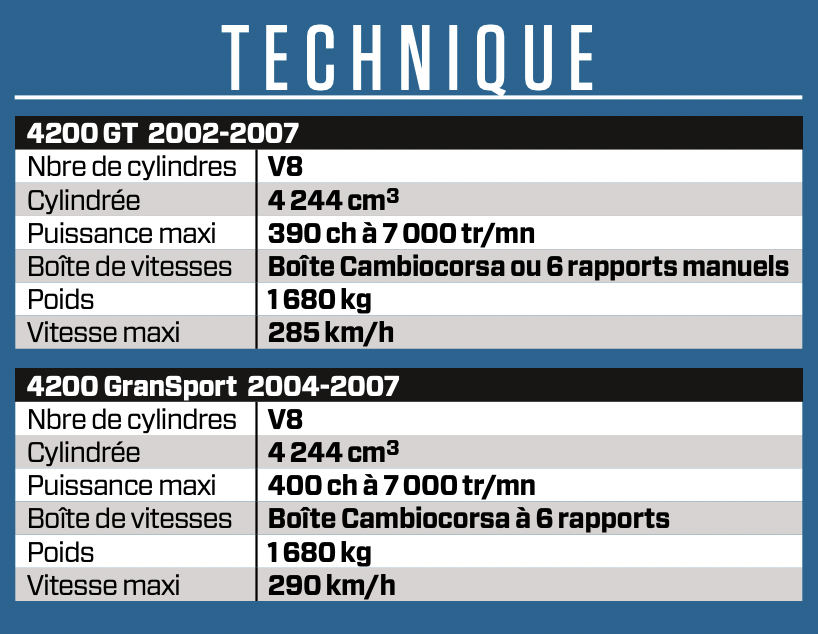Aujourd’hui, la Maserati 4200 GT s’affiche (en hausse) à partir de 20 000 €, les beaux exemplaires naviguant autour de 30 000 €…