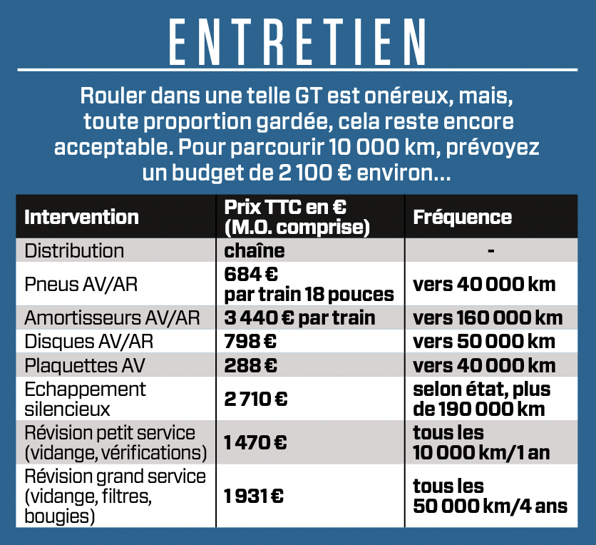 Ces postes de consommables demeurent accessibles pour une telle GT : comptez 798 € pour une paire de disques, 288 € pour un jeu de plaquettes et 684 € pour un train de pneus en 18 pouces.
