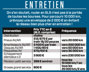 Avec un poids de 1 660 kg à vide minimum, la SLS fait souffrir ses périssables. C’est le cas des freins, en acier classique : comptez 575 € pour un jeu de plaquettes avant et 1 400 € pour des disques. Les pneus font face à de fortes contraintes : comptez 512 € pour le train avant et 675 € pour l’arrière. Quant aux amortisseurs qui gèrent la suspension pilotée, ils valent chacun 1 705 € pièce mais se révèlent solides dans le temps.