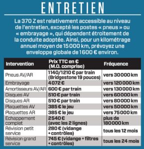 La Nissan 370Z adopte un robuste V6 24 soupapes atmosphérique, affichant un rendement plus que raisonnable (328 ch pour 3,7 litres de cylindrée). Cela ne plaide pas en la faveur du caractère, assez « lissé », mais ça profite au moins à la fiabilité, excellente. Ceci est d’autant plus vrai que ce bloc, de conception assez classique, dispose d’une transmission par chaîne. L’entretien se limite donc à une révision classique (avec vidange), à faire une fois par an (ou tous les 15000 km), facturée à un prix qui laisse rêveur : 170 €.