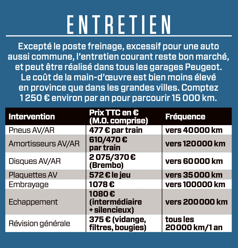 Par ailleurs, le moteur réclame un entretien annuel classique (ou tous les 20 000 km), comprenant une vidange (huile 0W30), un changement des bougies et du filtre. Comptez 380 € pièces et main-d’œuvre à Paris (et beaucoup moins en province).
