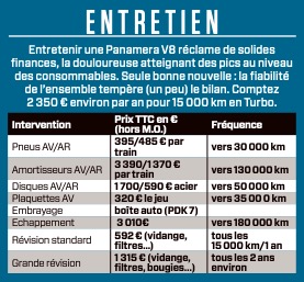 L’imposante Panamera est lourde : 1 920 kg au mieux en GTS et même 1 995 kg en Turbo S. Du coup, les « consommables » (pneus et freins, par exemple) souffrent. Ils s’usent rapidement en cas de conduite rapide. En particulier sur les modèles pourvus de l’efficace système optionnel PDCC (Porsche Dynamic Chassis Control). Les pneus, en 19 pouces minimum (255/45 R 19 à l’avant et 285/40 R 19 à l’arrière) sont chers (395 € pièce environ), de même que les disques : comptez 850 € pièce à l’avant… pour les simples modèles acier, sans la main-d’œuvre. Les disques en carbone-céramique valent, eux, le prix… d’une Dacia neuve !