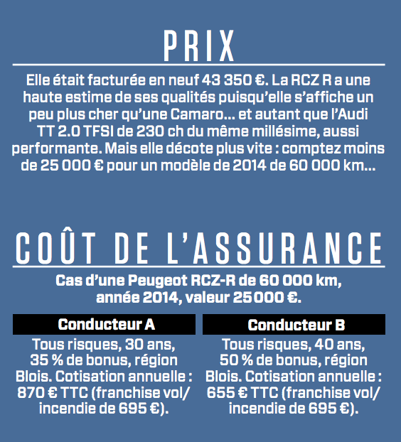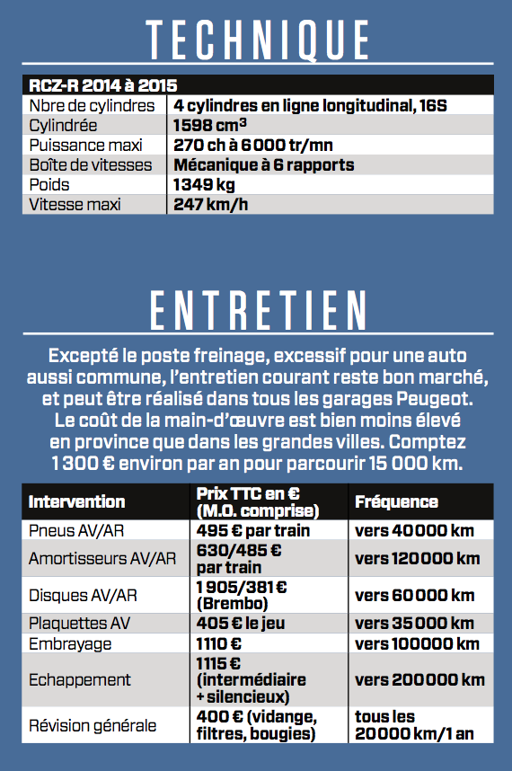 La RCZ R fait valoir ses différences, avec des performances (0 à 100 km/h en 6’’3, 247 km/h) inconnues jusqu’alors sur une Peugeot. Le freinage et la rigueur des trains roulants, à l’avenant, permettent d’exploiter au mieux un châssis rigide et équilibré. Ce concentré d’efficacité est affiché en occasion à partir de 20 000 € !