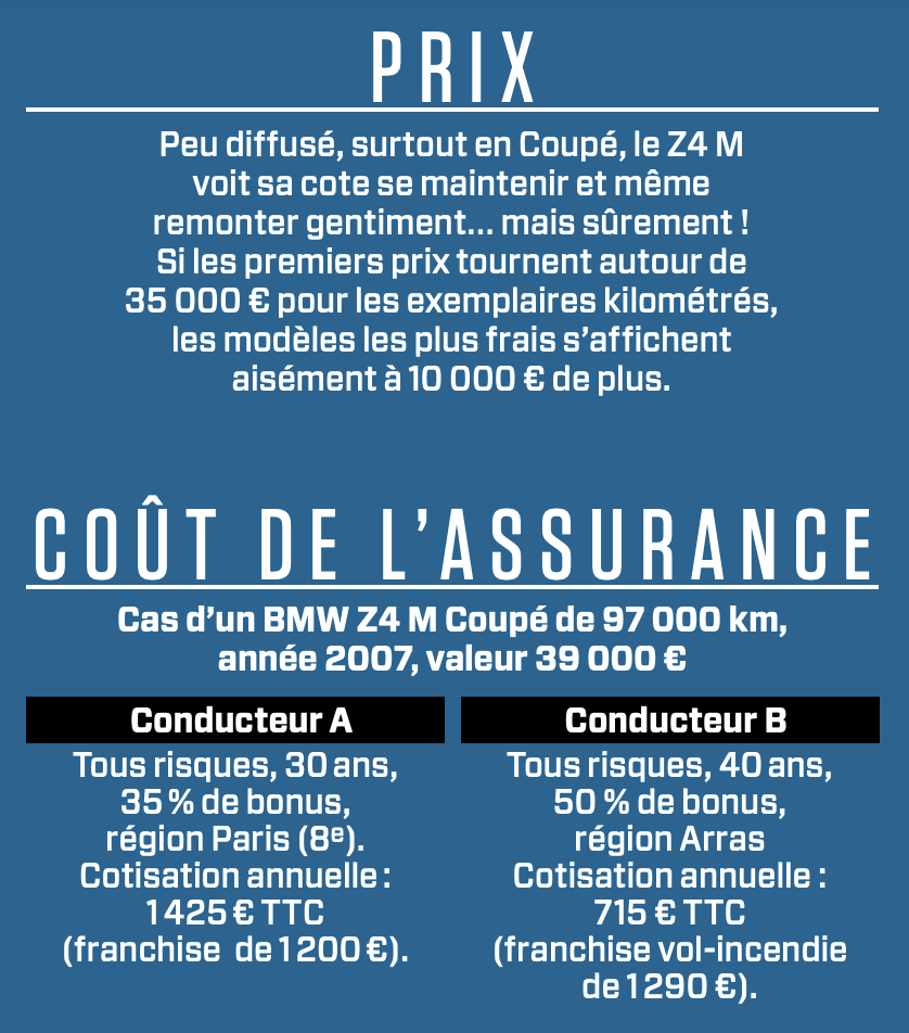 Sport Auto vous renseigne sur les coûts d'assurance de la BMW Z4 M Coupé, commercialisée de 2006 à 2009 pour un prix d'achat débutant autour de 35 000 euros.